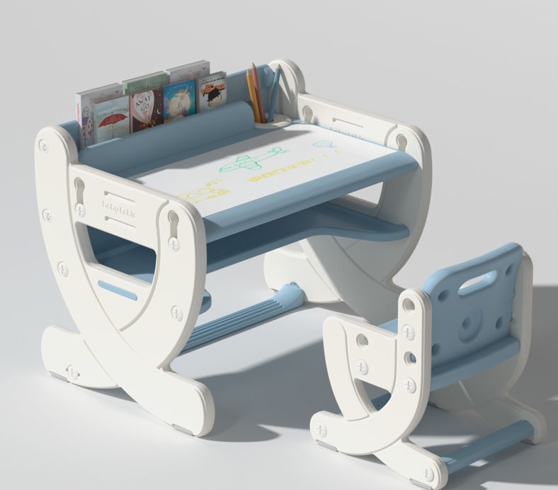 Fun and multifunctional, enjoy a tabletop playground. Perfect for eating, playing, and learning, practical up to 8 years old. Creative design with dual purposes. Unique shape with adjustable height, unobstructed leg space for added comfort. Made from eco-friendly PE material, odorless and safe.