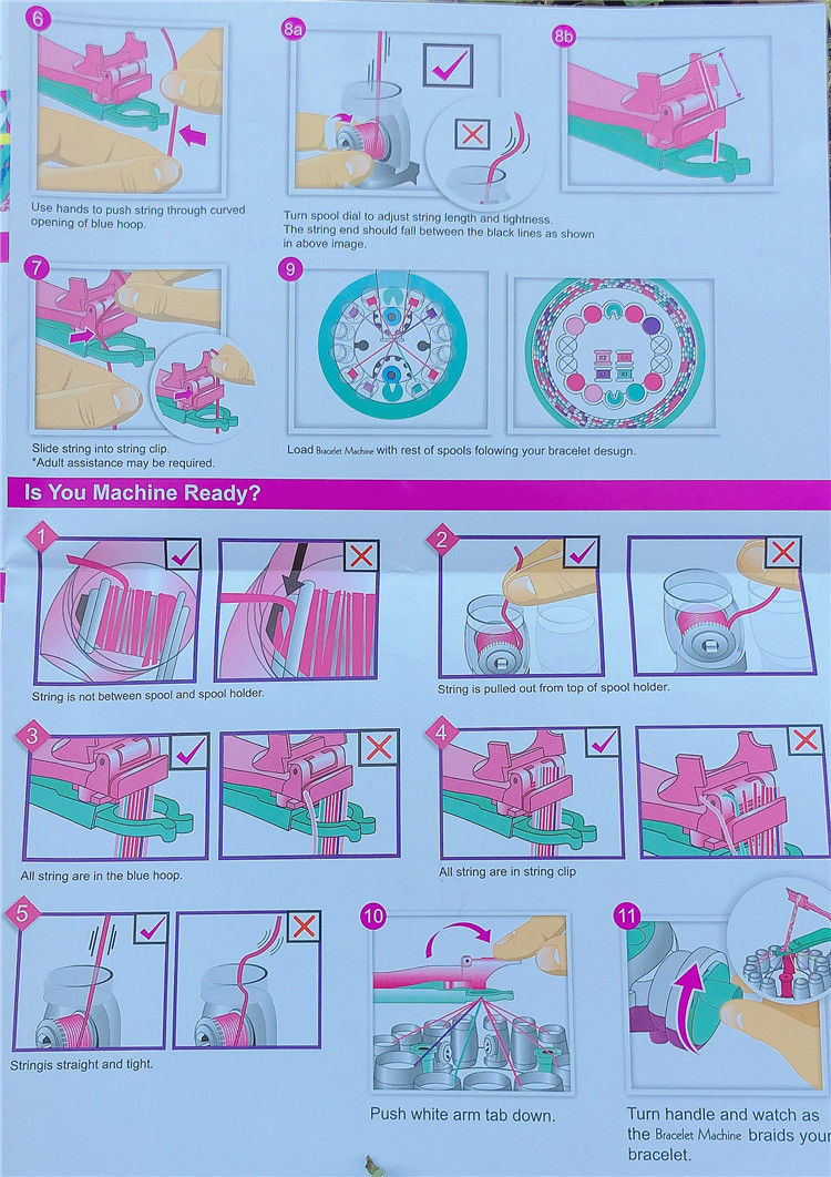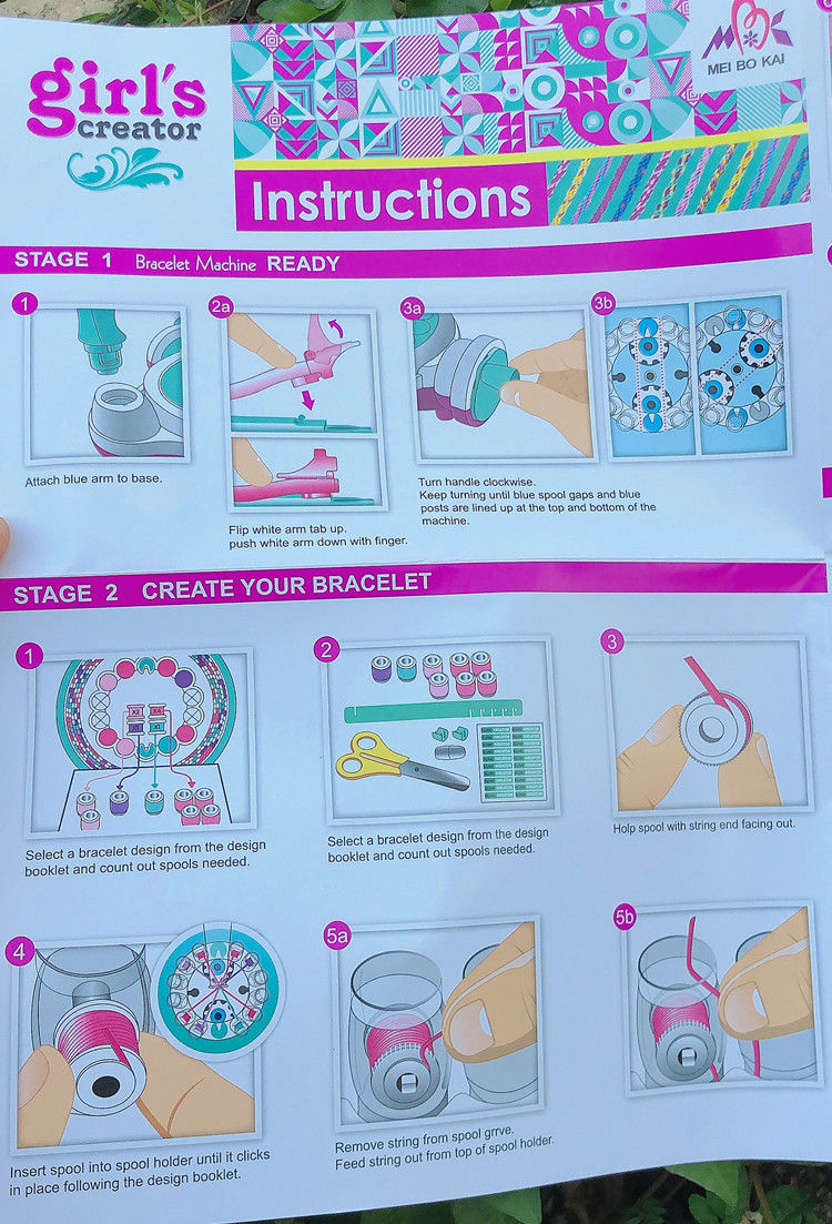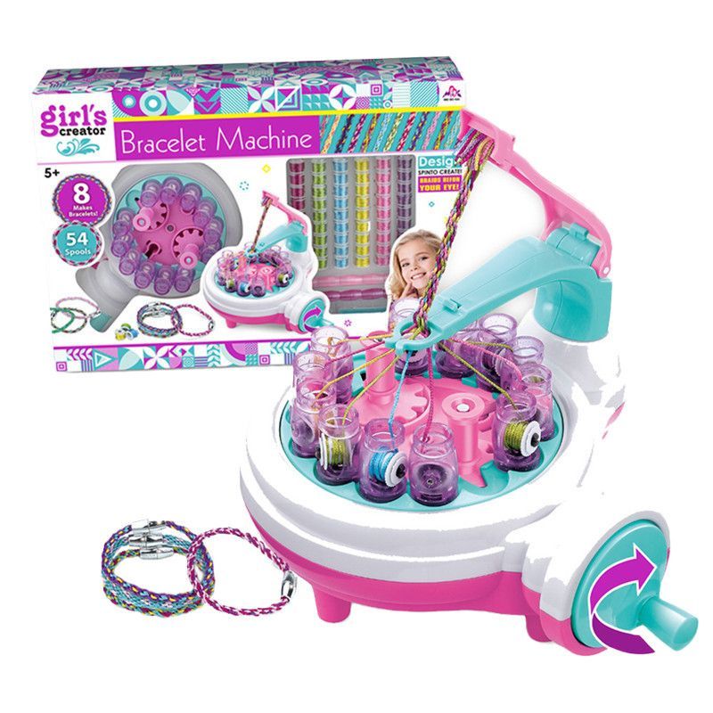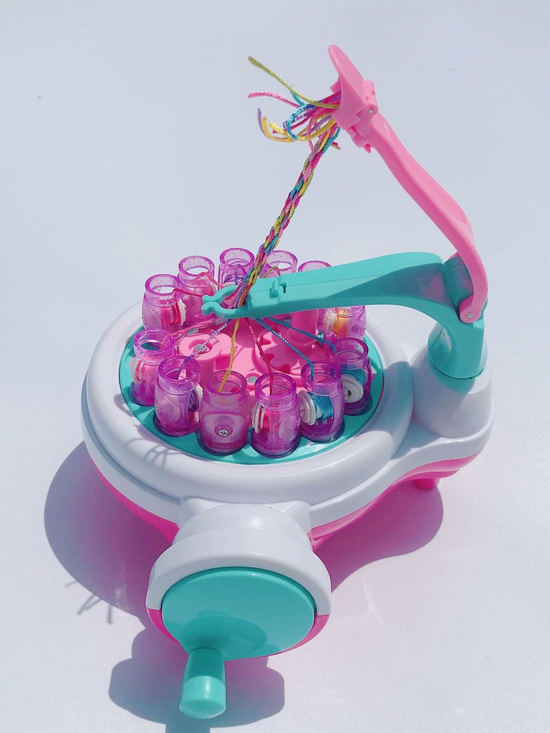 Create your own unique, colorful bracelets in just three simple steps: LOAD-SPIN-CREATE. Choose your pattern, load the spools into the machine, and spin! As you turn the handle, watch your braid magically weave together, forming a beautiful bracelet in under a minute!